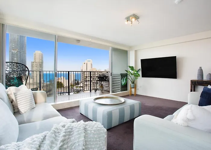 Relax With Beach & River Views In 3Br Apt W/ Pool est située au centre de Gold Coast et dispose d'un jacuzzi, d'un sauna et d'une piscine couverte. La Plage de Surfers Paradise est à quelques minutes de marche et Club nautique Southport Yacht Club est dans une zone de 3 km.